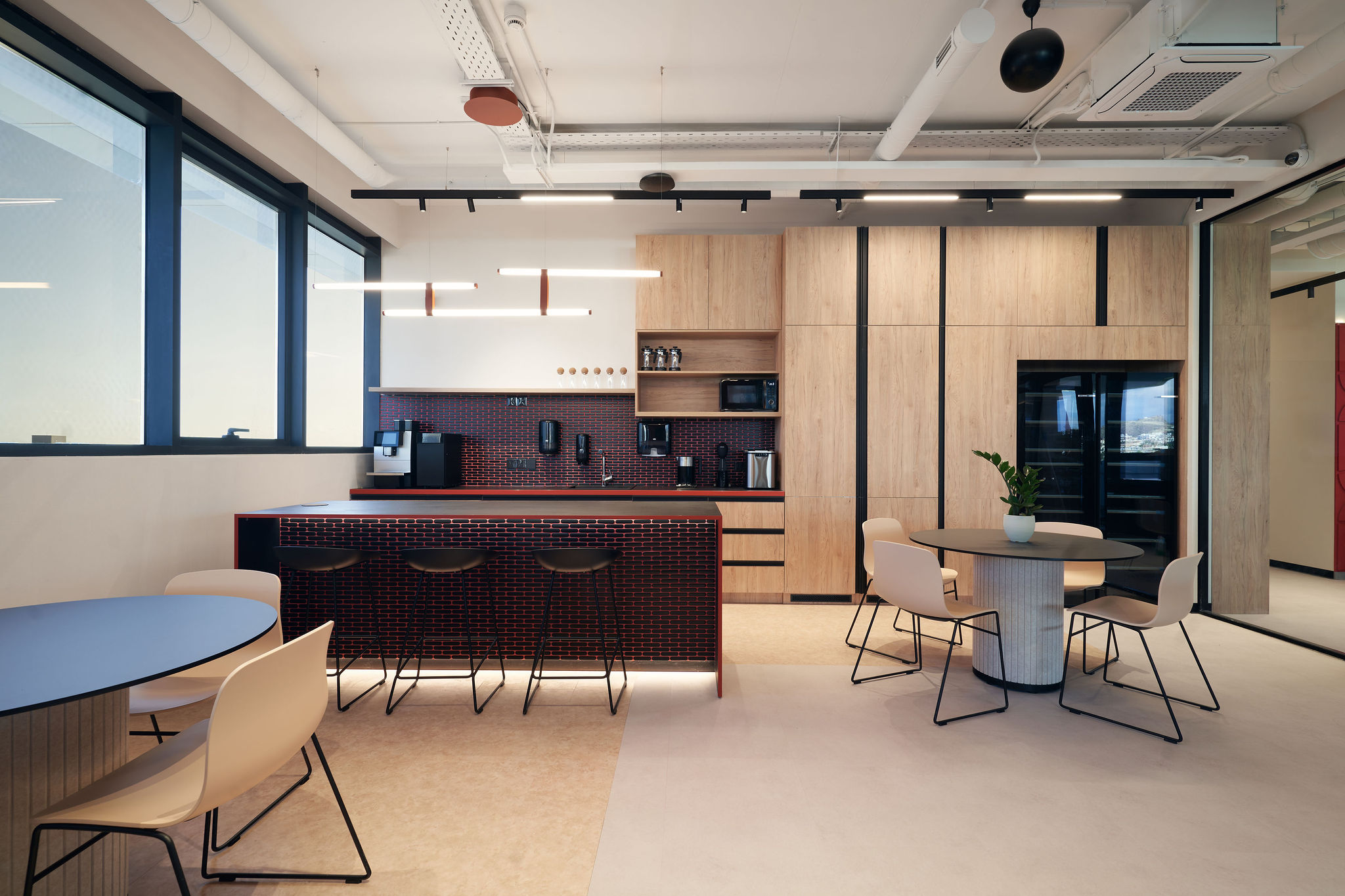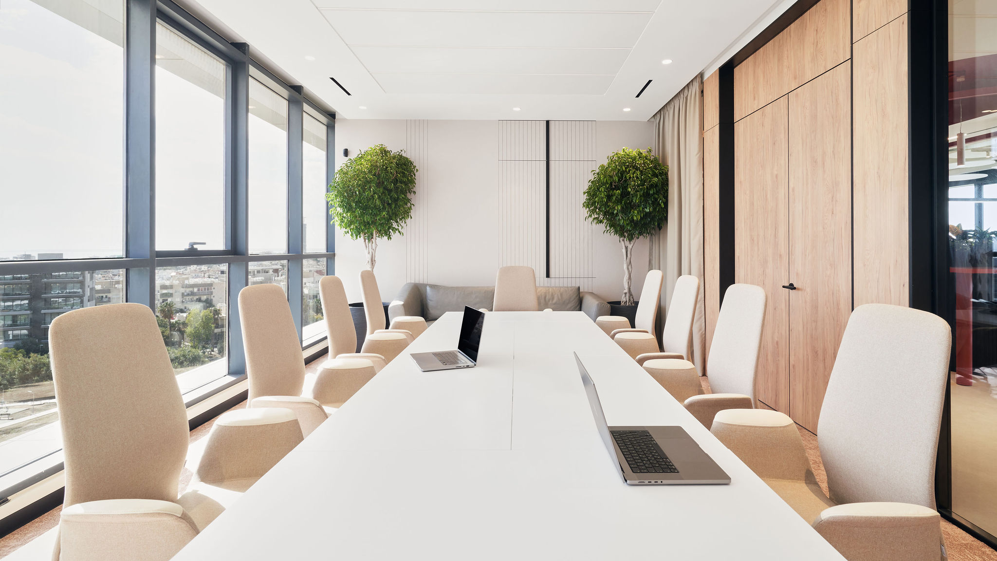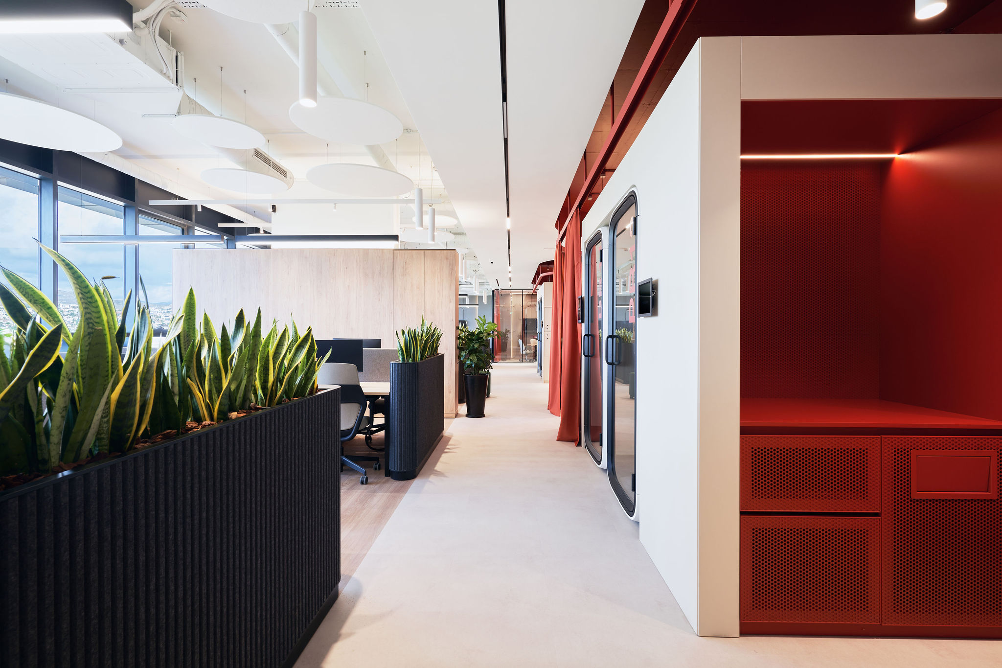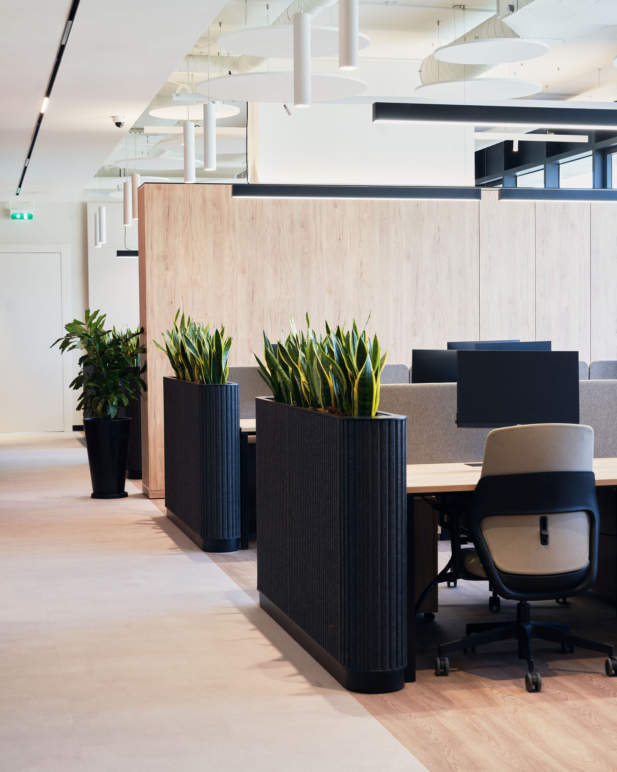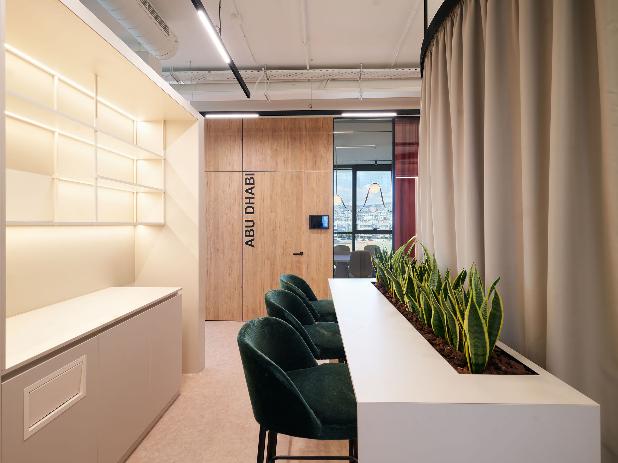 The fit-out featured flush-mounted doors, wall and acoustic panels, built-in cabinets, work and conference tables, upholstered seating, personal storage lockers, pedestals, and metal ceiling structures. Materials were carefully selected for durability and aesthetic appeal, including painted and veneered MDF, chipboard, metal, glass, artificial and natural stone, and HPL surfaces.