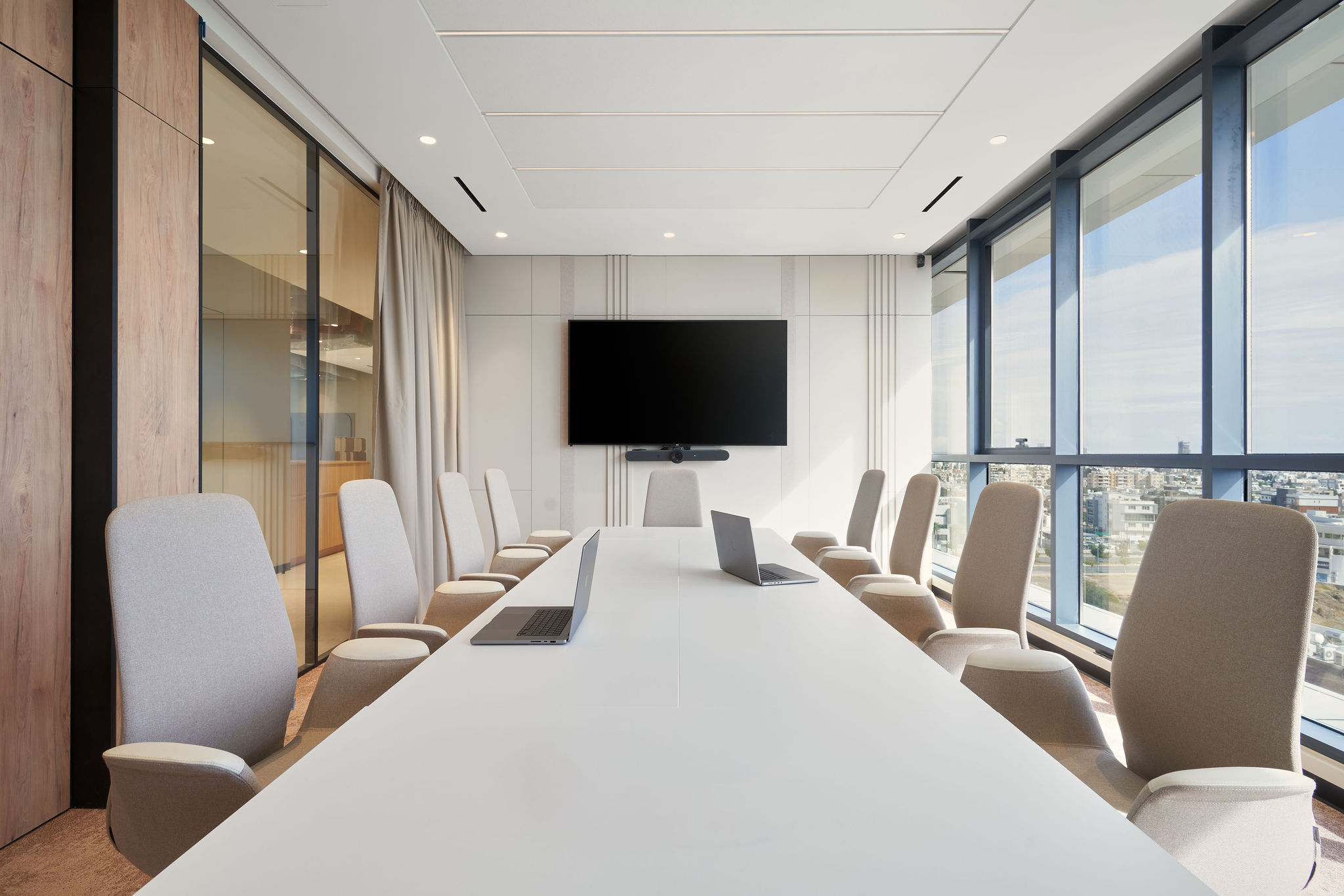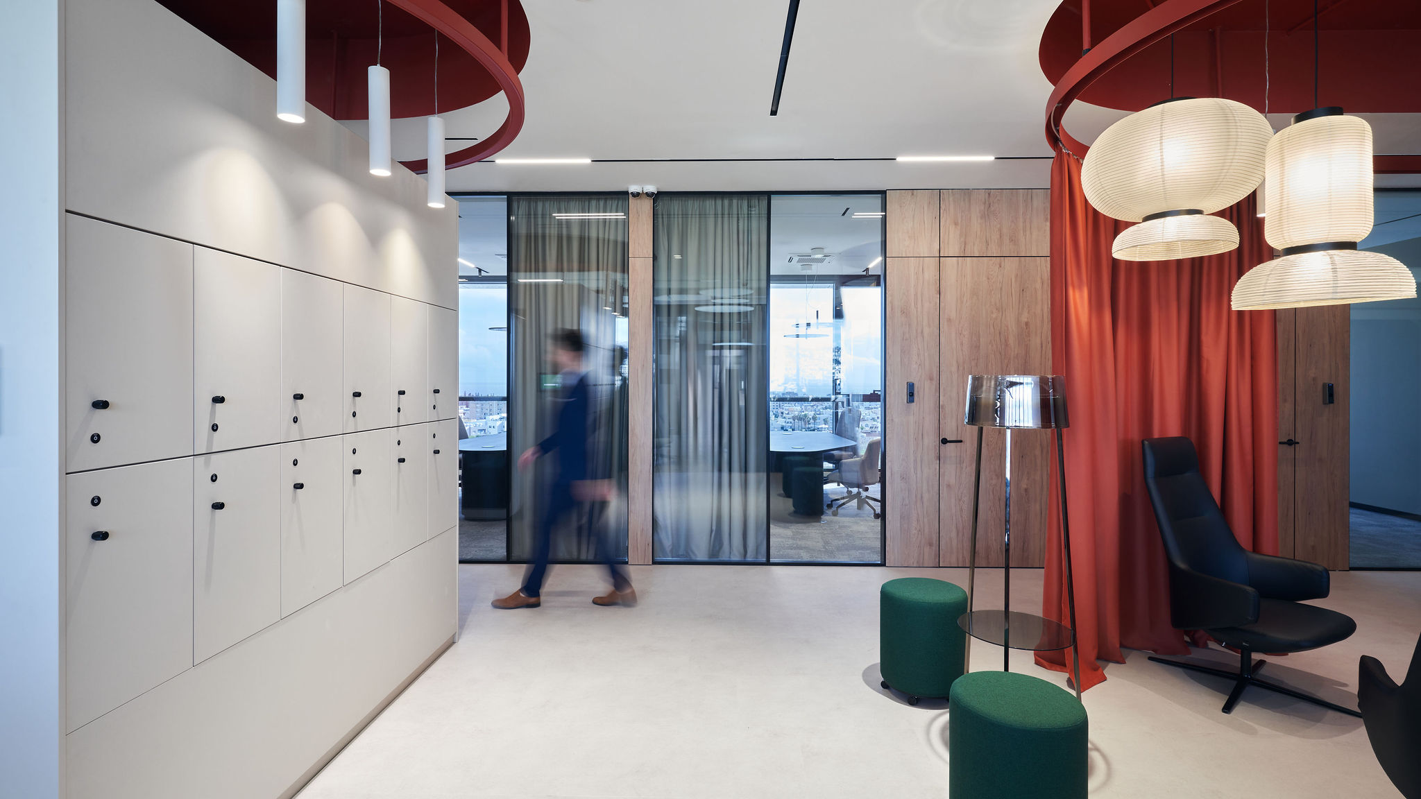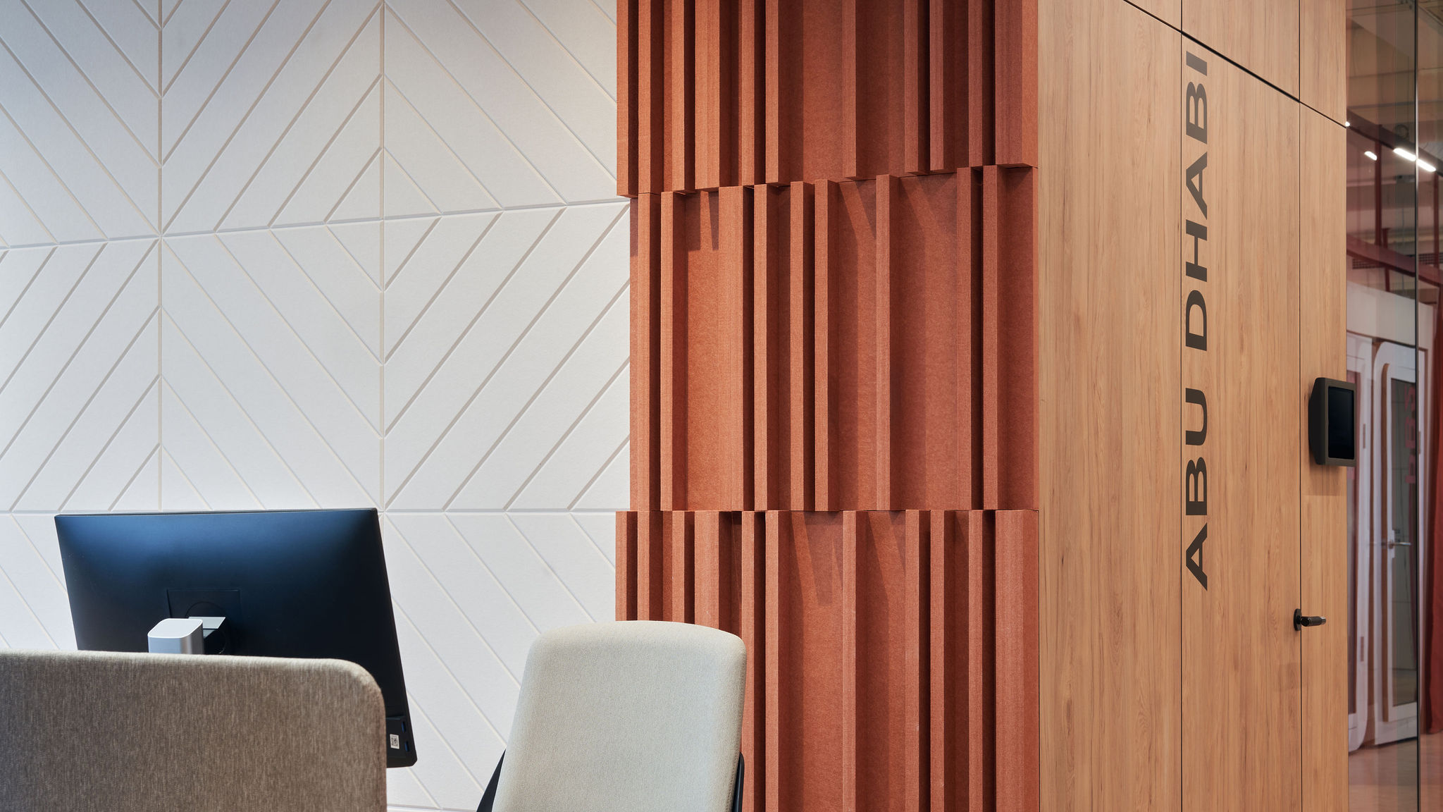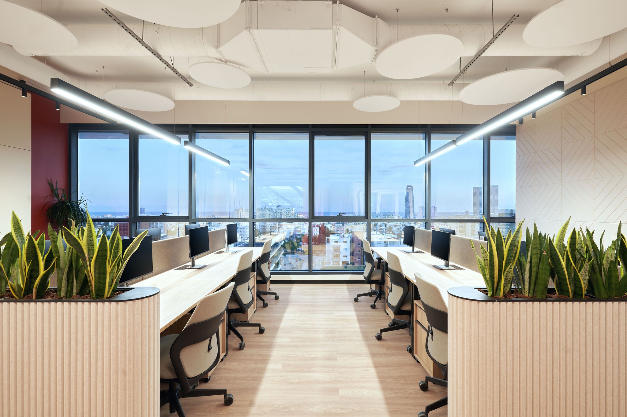 The fit-out featured flush-mounted doors, wall and acoustic panels, built-in cabinets, work and conference tables, upholstered seating, personal storage lockers, pedestals, and metal ceiling structures. Materials were carefully selected for durability and aesthetic appeal, including painted and veneered MDF, chipboard, metal, glass, artificial and natural stone, and HPL surfaces.