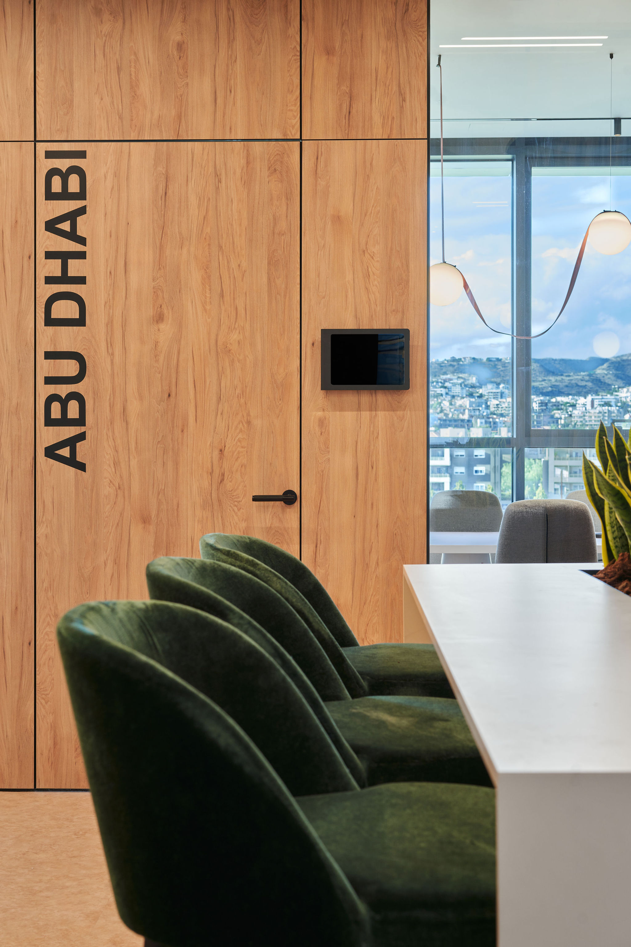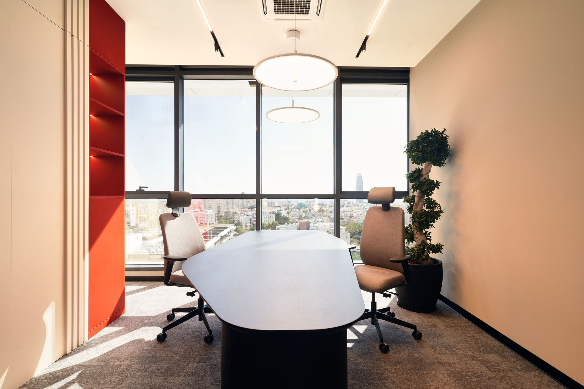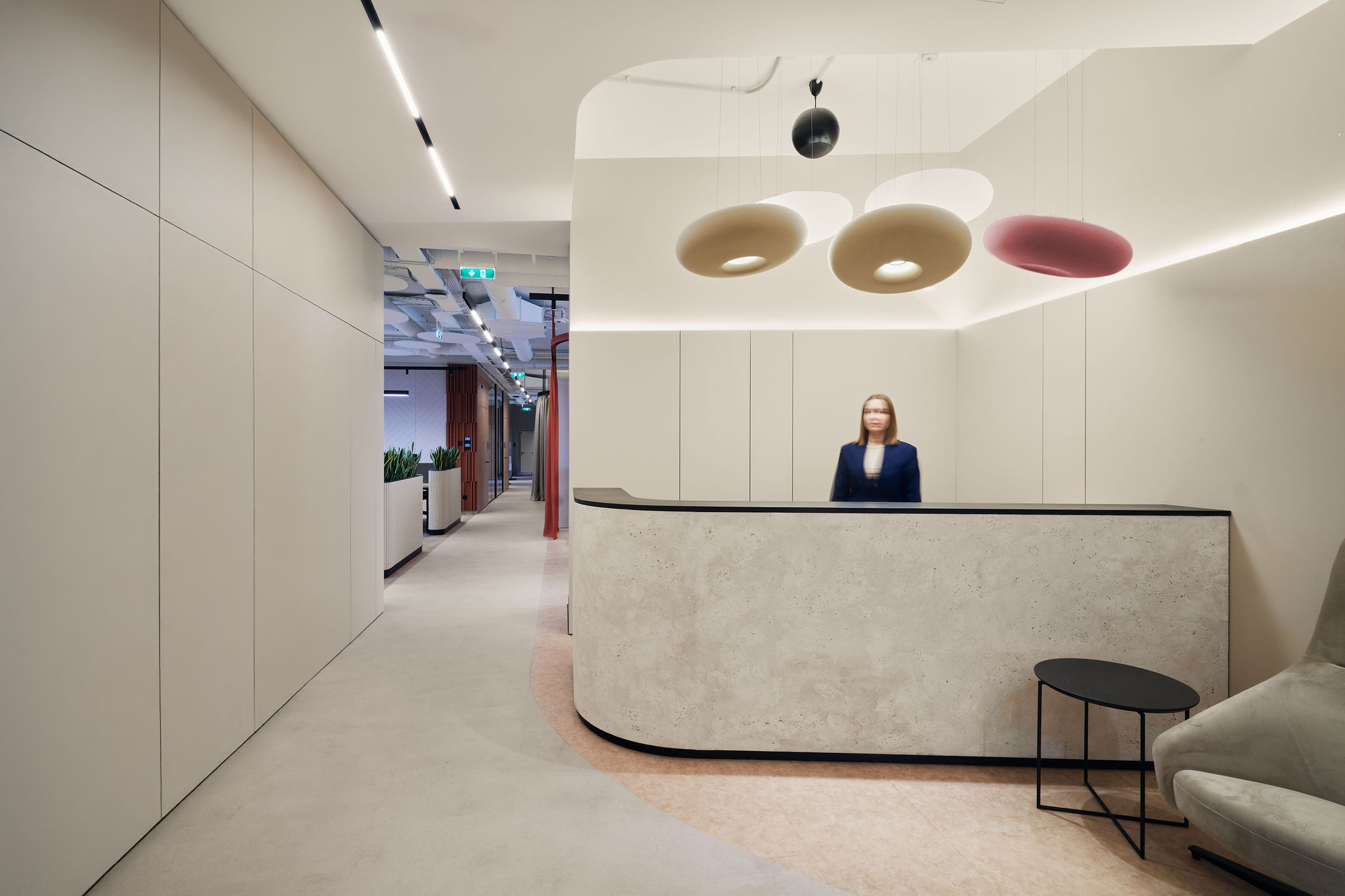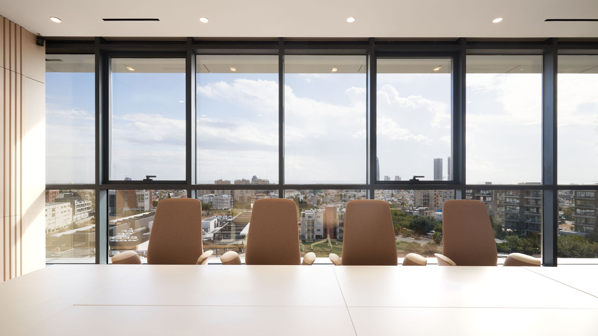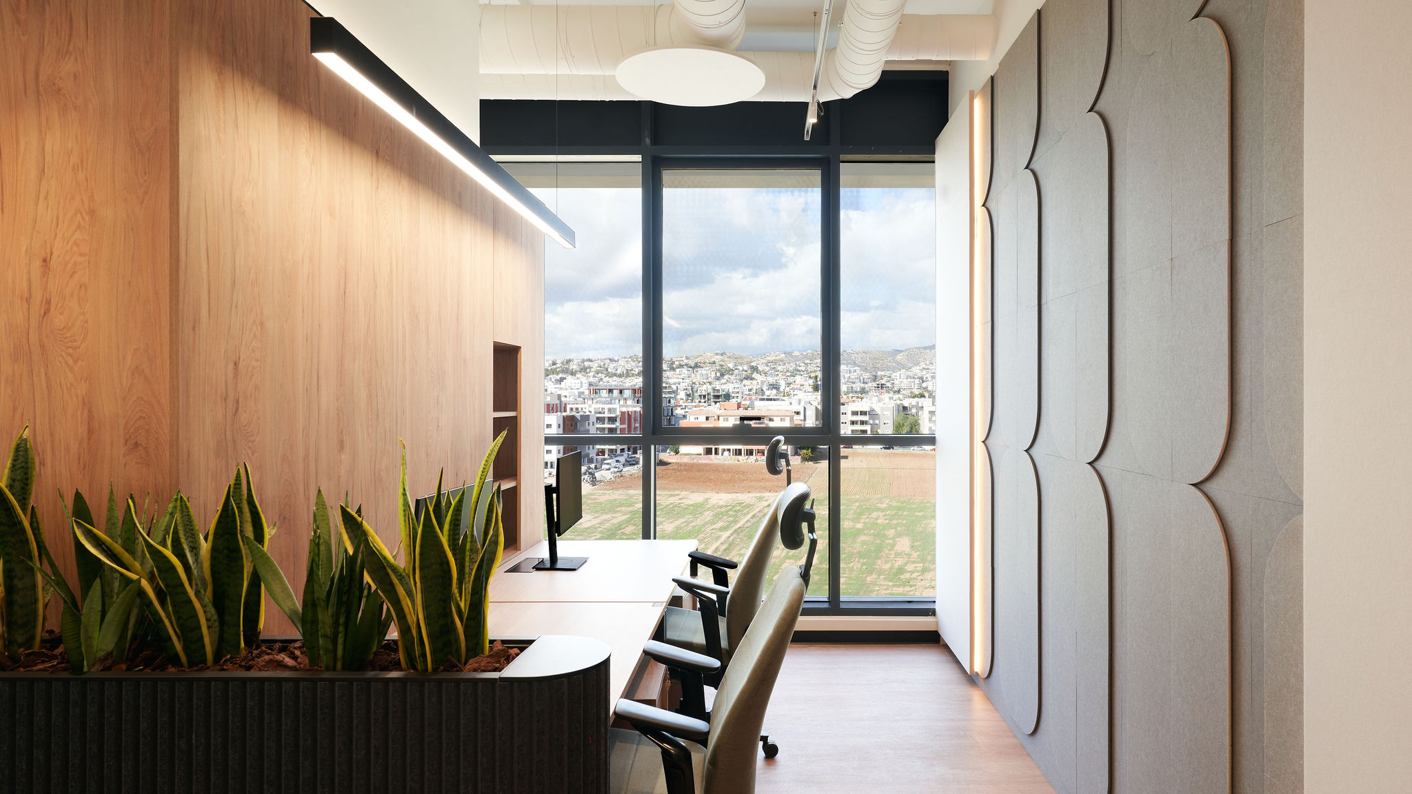 The fit-out featured flush-mounted doors, wall and acoustic panels, built-in cabinets, work and conference tables, upholstered seating, personal storage lockers, pedestals, and metal ceiling structures. Materials were carefully selected for durability and aesthetic appeal, including painted and veneered MDF, chipboard, metal, glass, artificial and natural stone, and HPL surfaces.