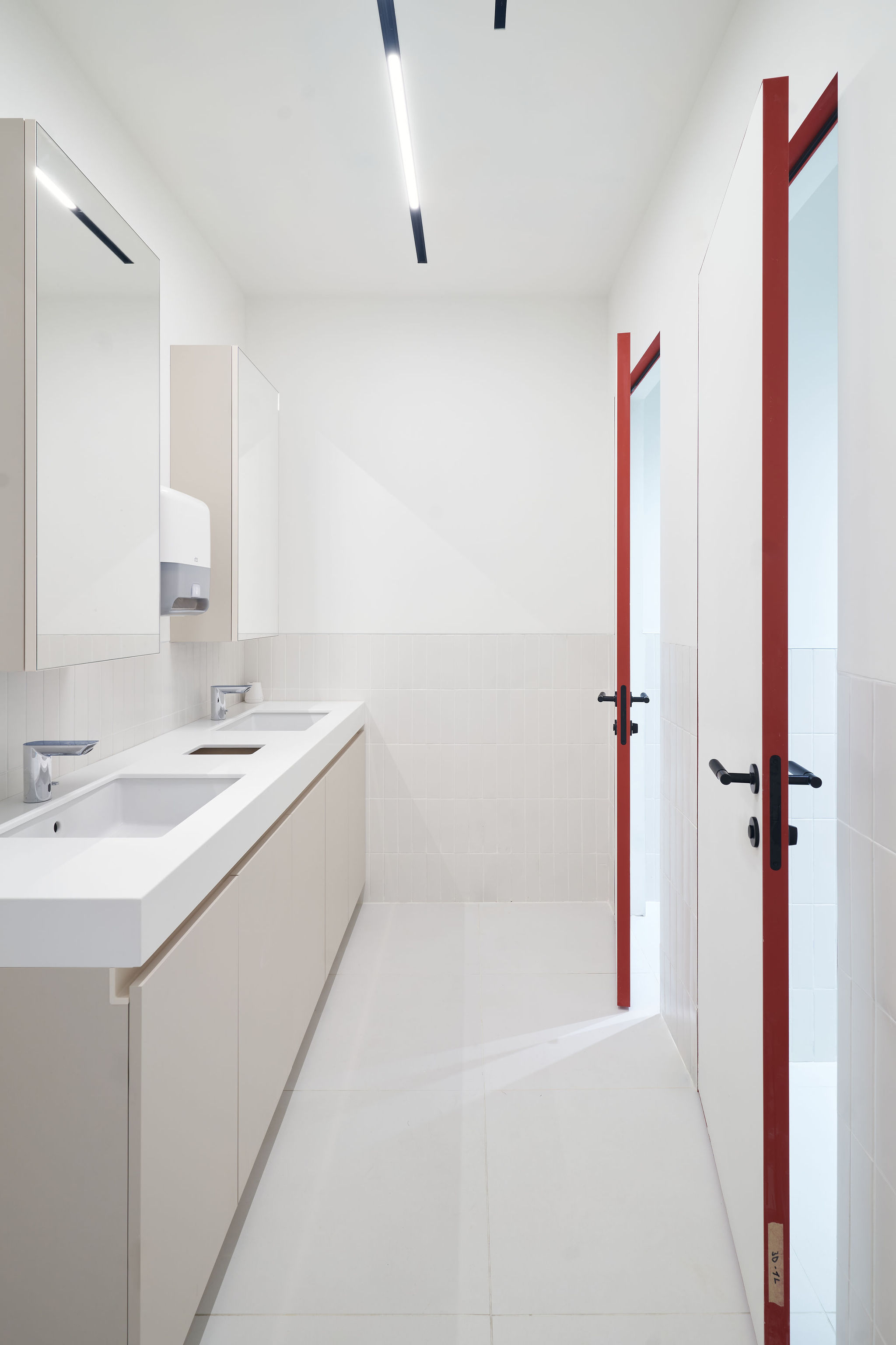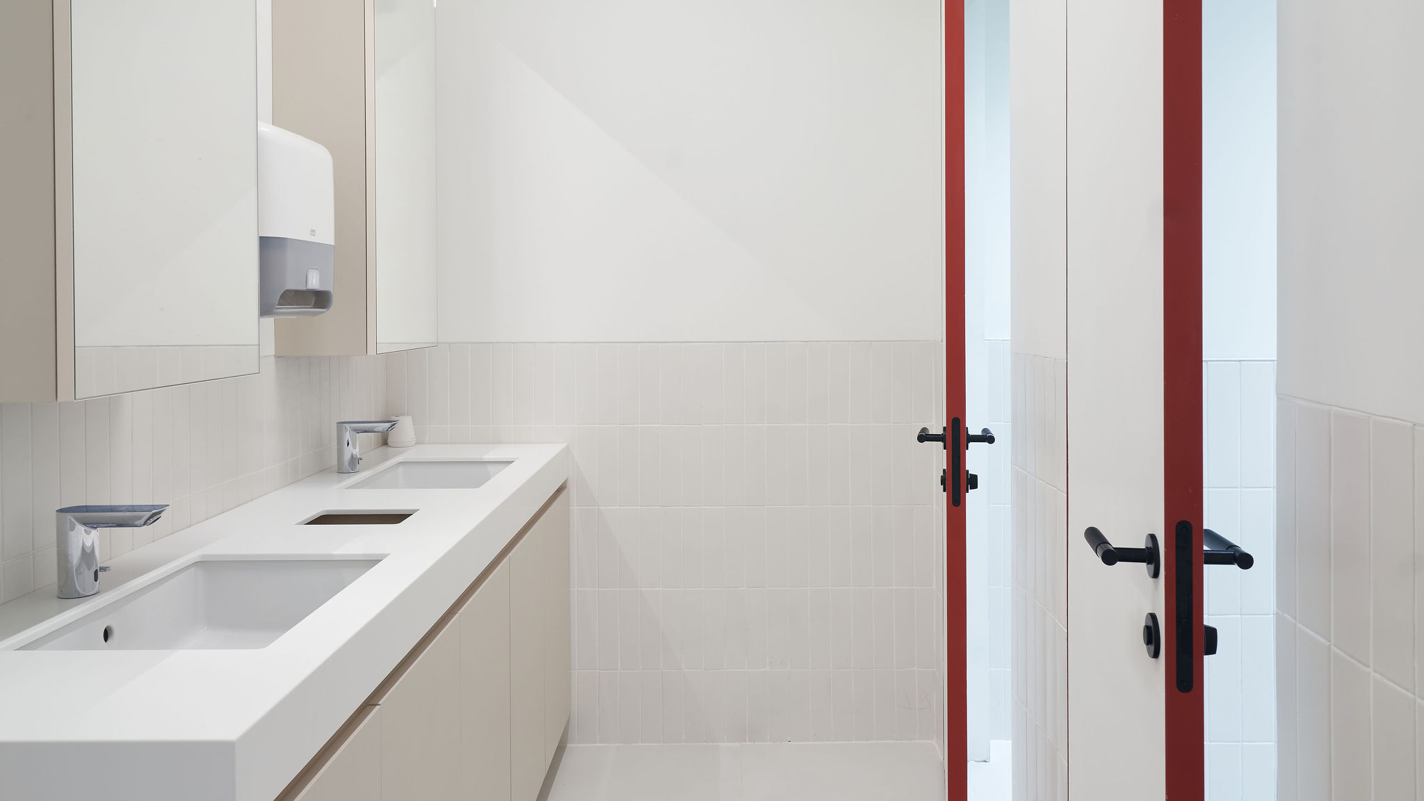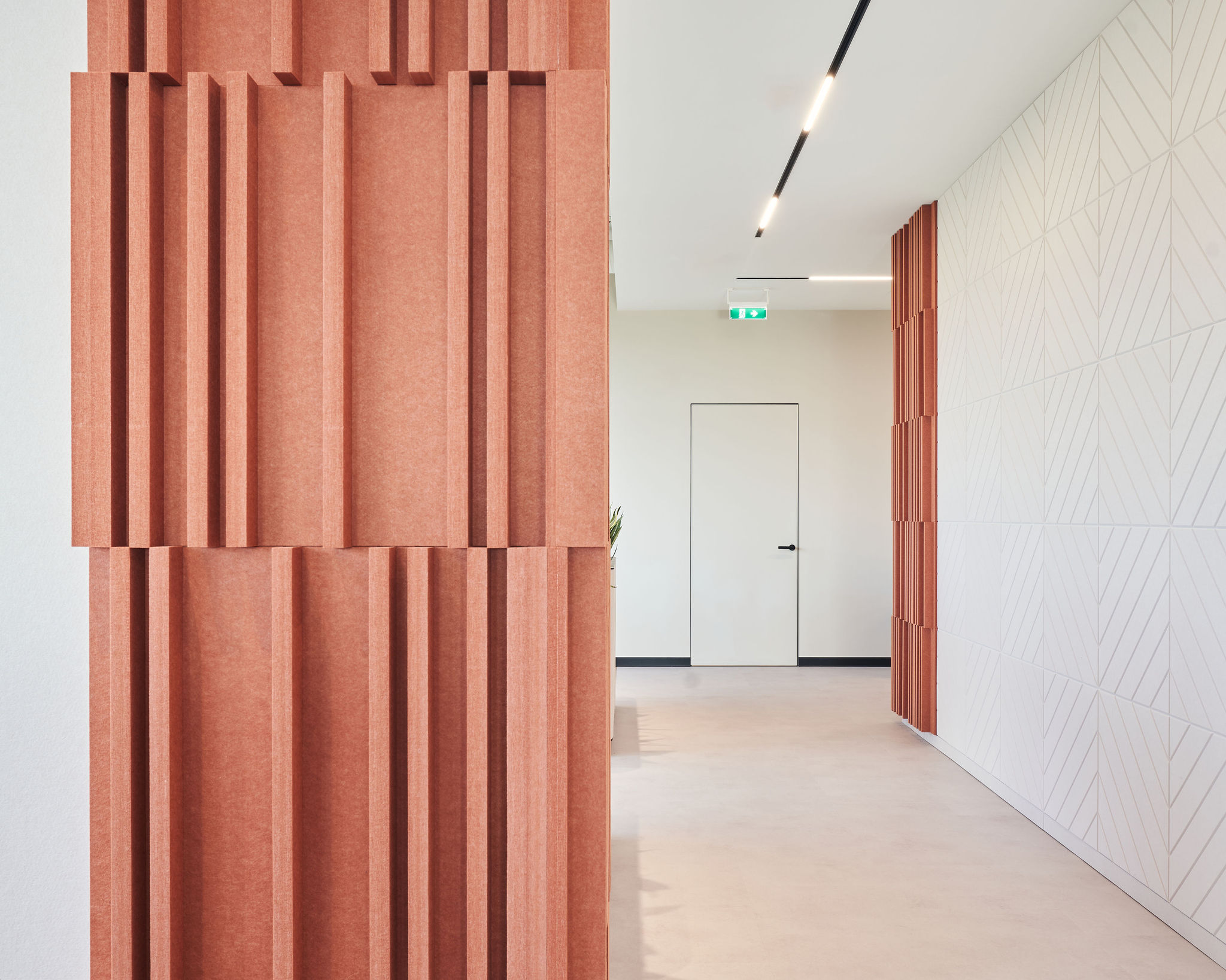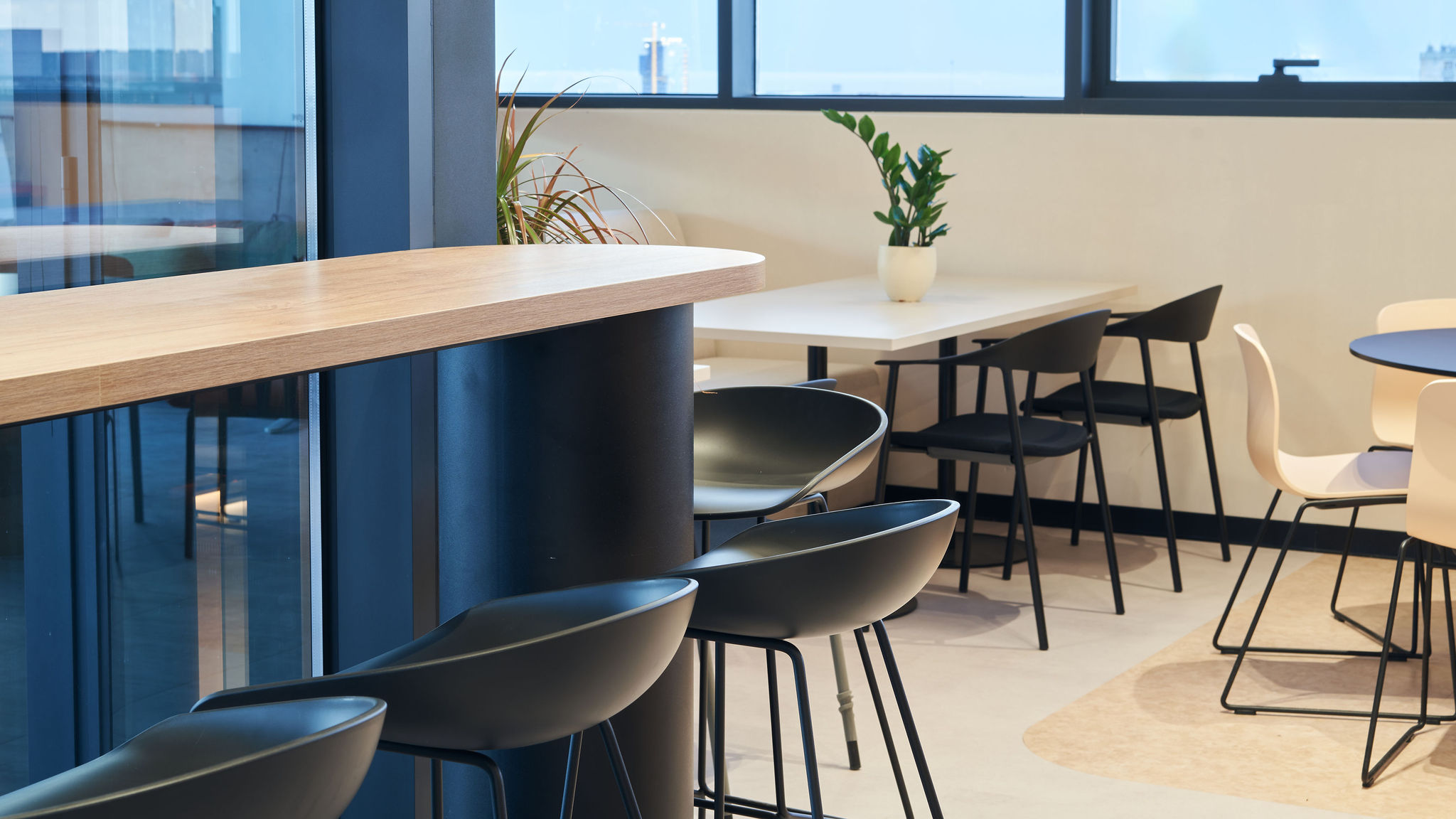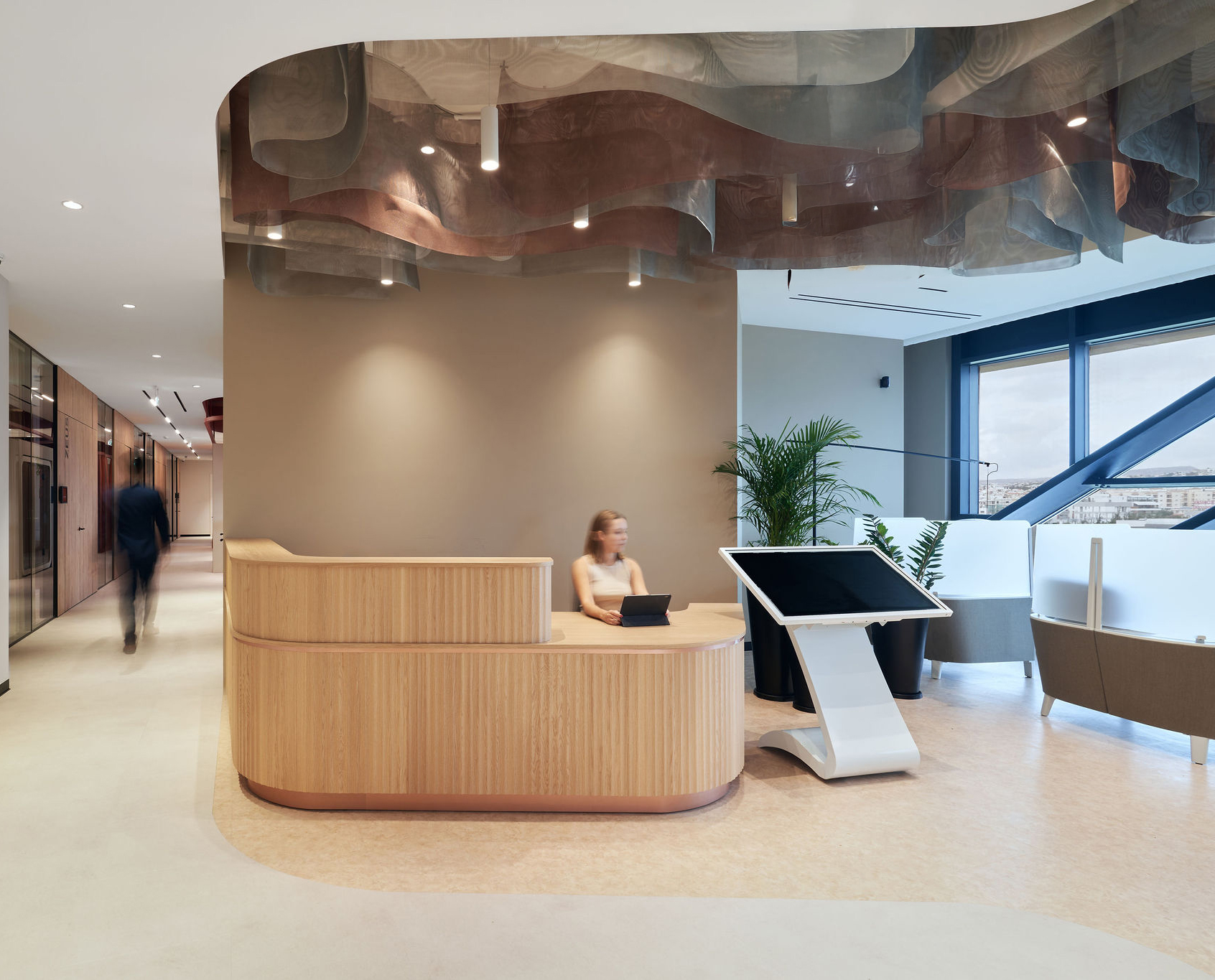 The fit-out featured flush-mounted doors, wall and acoustic panels, built-in cabinets, work and conference tables, upholstered seating, personal storage lockers, pedestals, and metal ceiling structures. Materials were carefully selected for durability and aesthetic appeal, including painted and veneered MDF, chipboard, metal, glass, artificial and natural stone, and HPL surfaces.