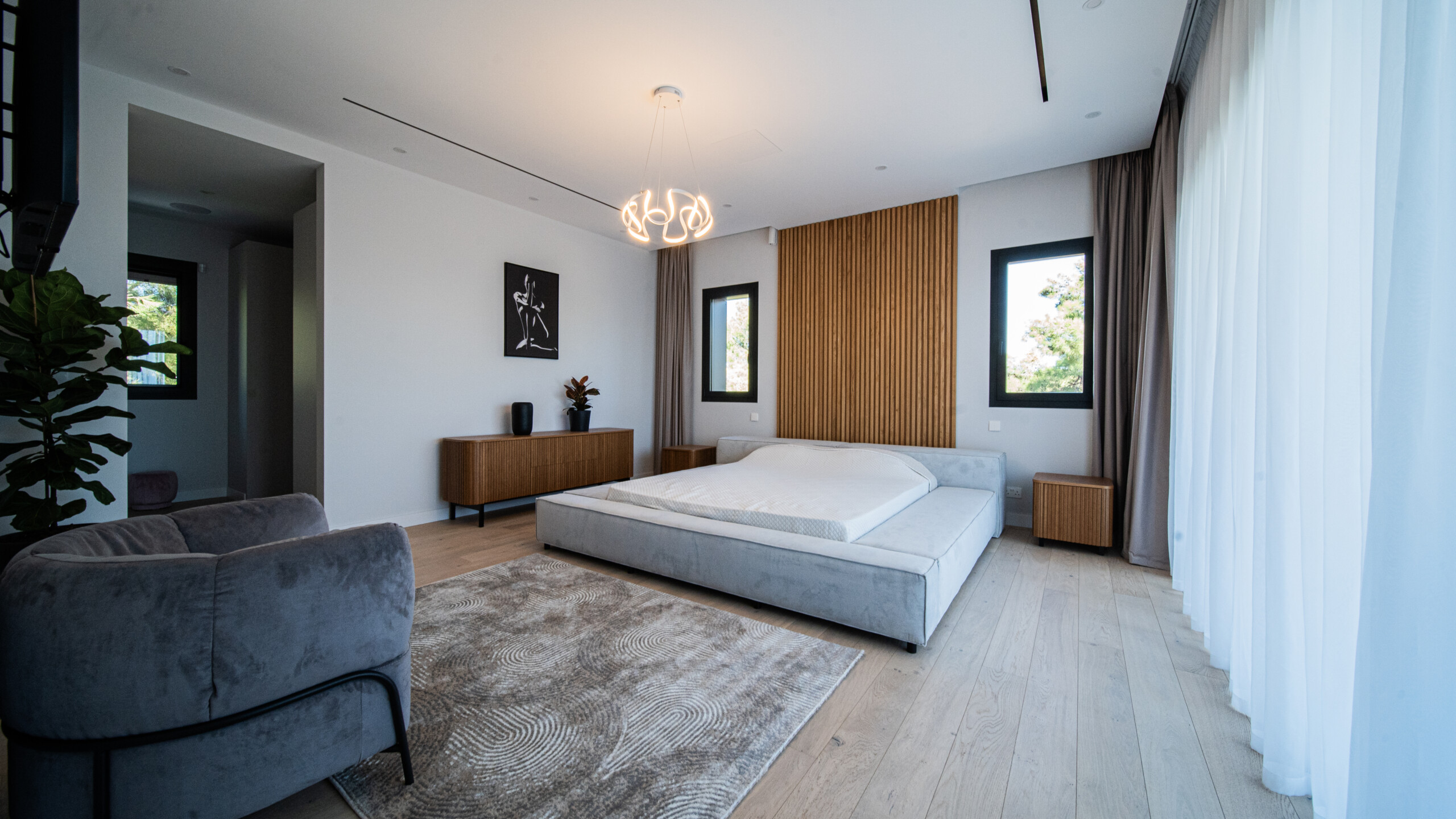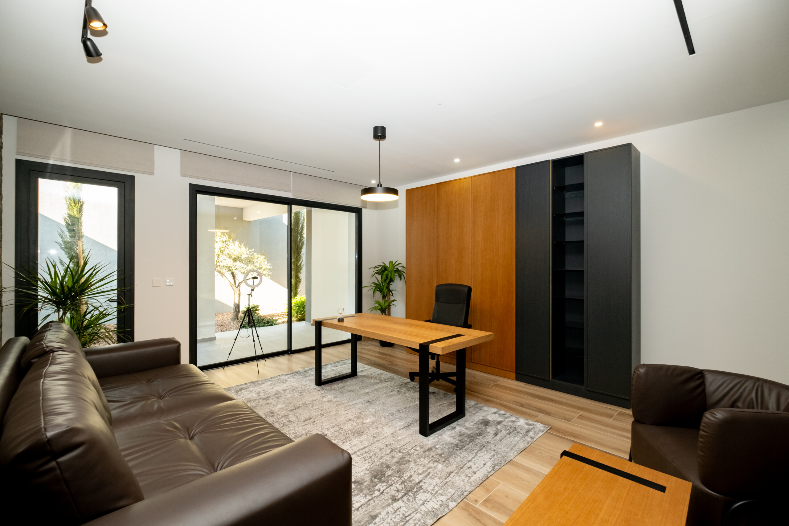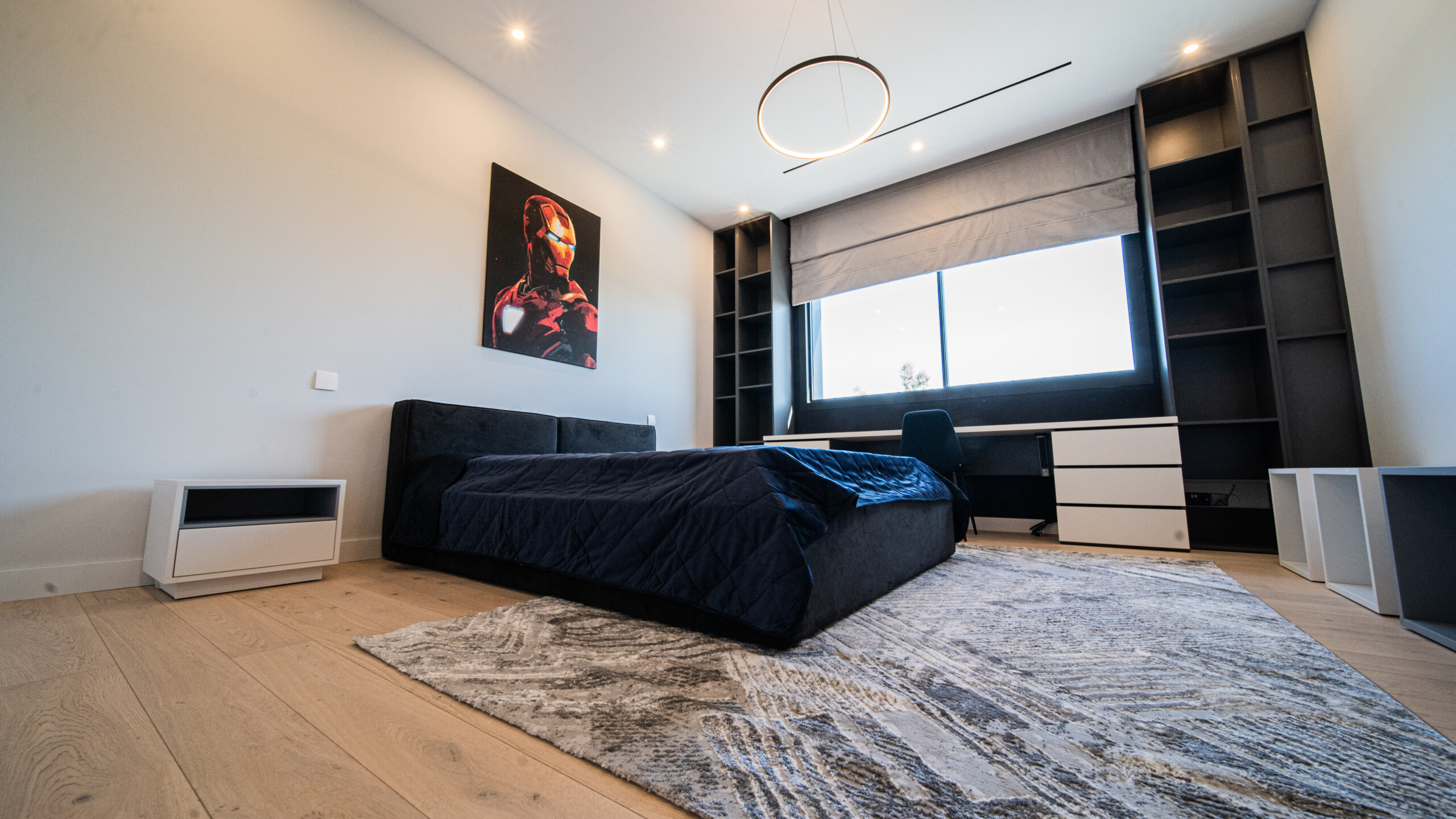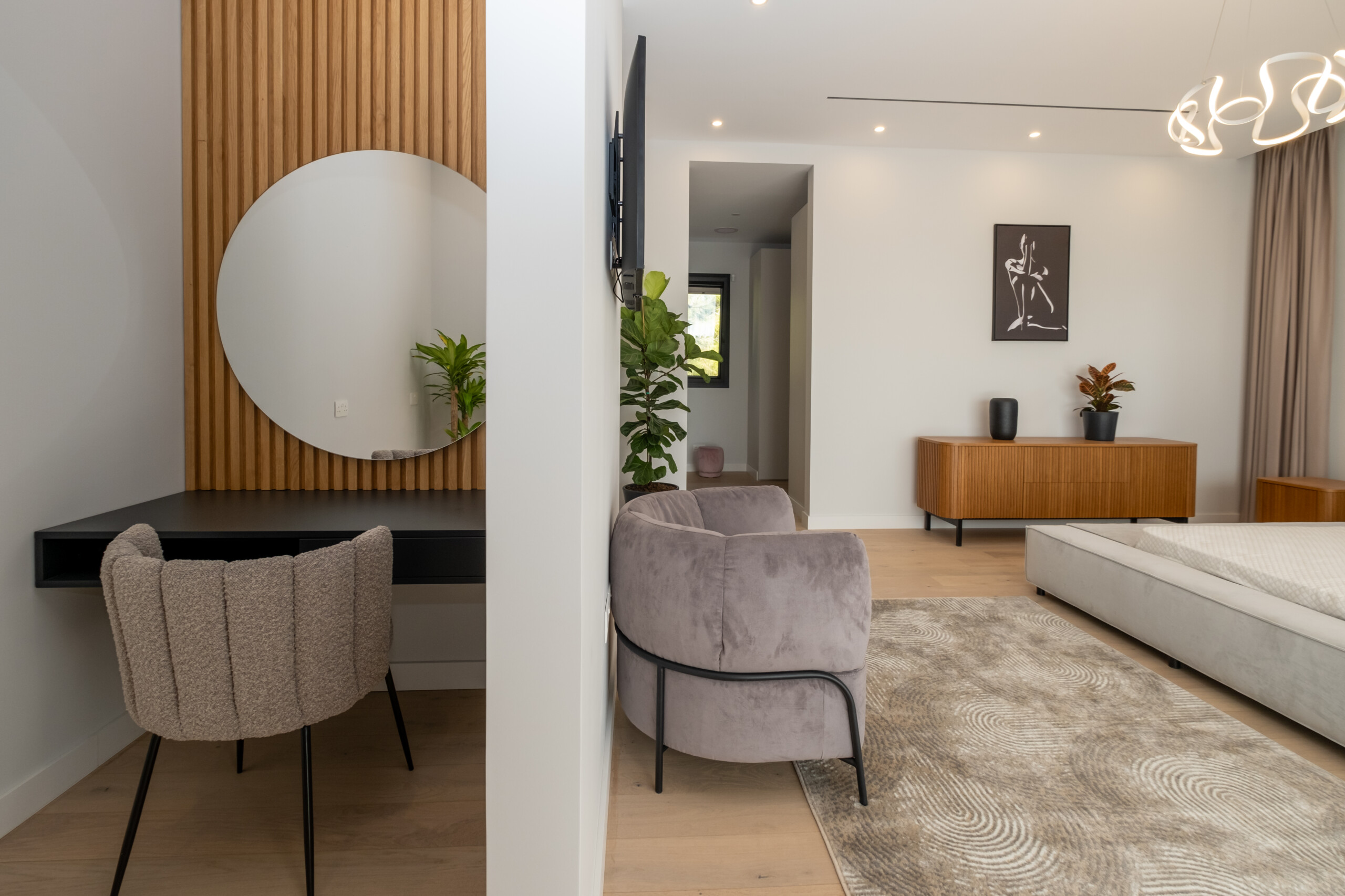 Our scope covered all key areas of the property, including the study, master bedroom with en-suite bathroom, guest bedrooms, children’s bedrooms and play areas, as well as staff accommodation. The project included wardrobes, tables, and a full range of casegoods and upholstered furniture for living areas and bedrooms. Each space was carefully planned to balance functionality with aesthetic harmony, with particular attention to storage design, proportions, and fine detailing to ensure a seamless flow throughout the villa.